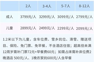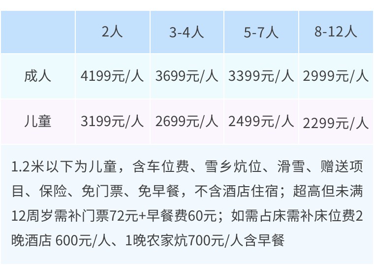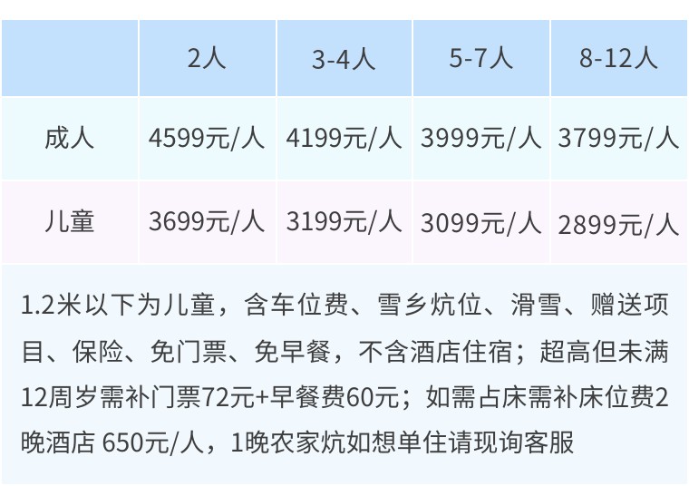 1.2米以下为儿童,含车位费、领队费、雪乡炕位、滑雪、赠送项目、保险、免门票、免早餐,不含酒店住宿正常1.2米以下免票如遇收费自理;超高但未满12周岁需补门票72元+早餐费60元,请参考单房差费用。
