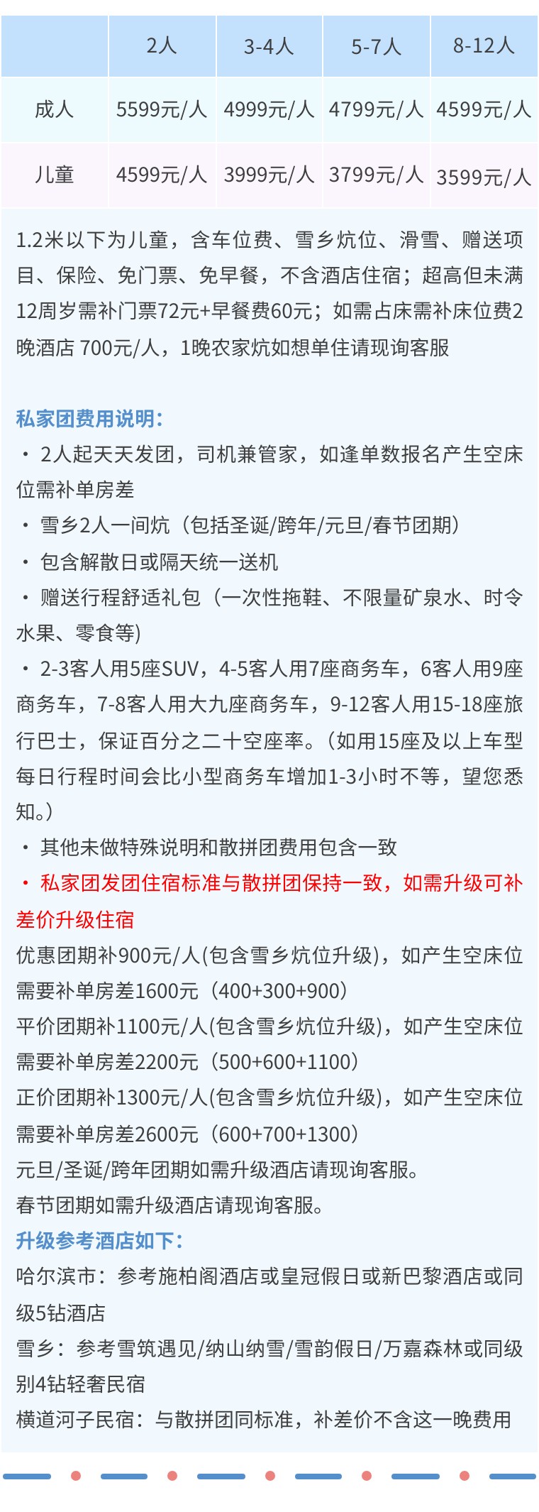 正价团期:2晚酒店 600元/人、1晚雪乡农家炕1人包炕补700元,2人包炕无需补差价。