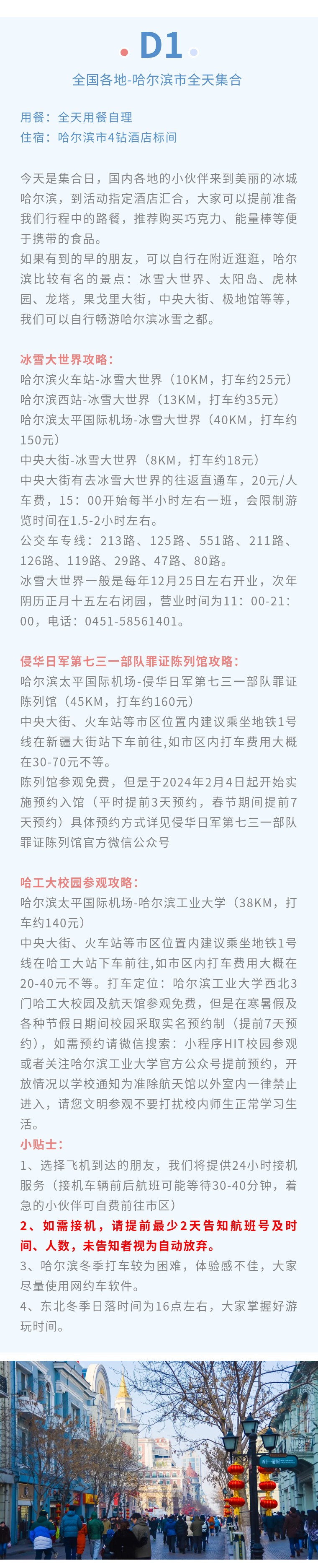 4、不含哈尔滨市送机:包车5座轿车150元/趟,夜航190元;7座商务车240元/趟,夜航290元/趟;夜航时间为21:00及以后-次日07:00及之前起飞的航班,春节团期+50元/台车,包车费用以哈尔滨主城区前往太平机场定价(南岗区、道里区、道外区),如需其他区域包车请联系客服现询价。