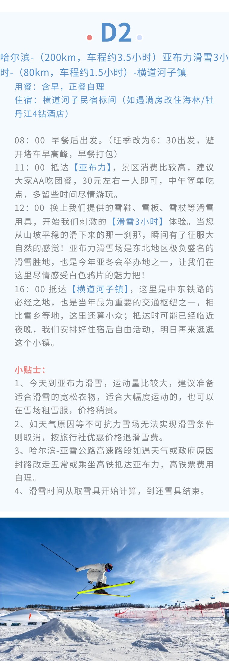 1、住宿:哈尔滨4钻酒店标间1晚,横道河子镇民宿标间1晚(如遇满房改住海林/牡丹江4钻酒店标间),雪乡2人间独立卫浴农家炕(圣诞/跨年/元旦/春节团期为男女分开4人间拼炕)