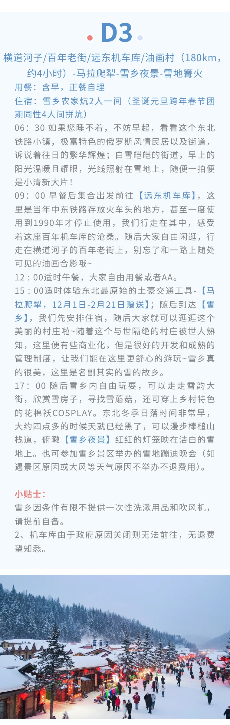 3、赠送雪乡雪地蹦迪晚会(如遇景区原因或大风等天气原因不举办不退费用)。