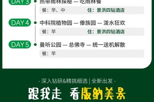 4、门票:野象谷(不含索道),热带雨林徒步,曼掌傣寨,中科院植物园(含电瓶车)、傣族园(含电瓶车)、曼听公园;