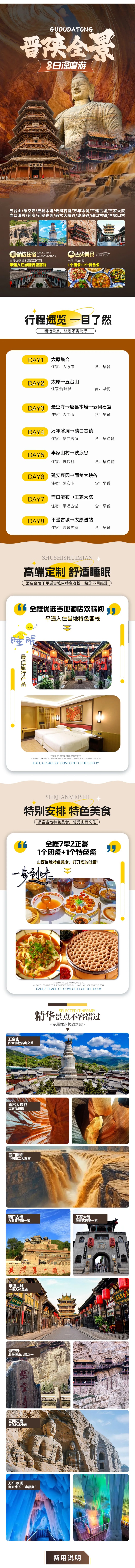 早餐之后前往世界上最大的黄色瀑布,【壶口瀑布】上游黄河水面宽300米,在不到500米长距离内,被压缩到20—30米的宽度。1000立方米/秒的河水,从20多米高的陡崖上倾注而泻,形成“千里黄河一壶收”的气概。游玩1个半小时后出发民间小故宫【王家大院】,元仁宗皇庆年间,先祖王实迁至静升村,从耕作与兼营豆腐业开始发家。明末靠贩卖牲畜崛起,清初因捐献军马获清政府嘉奖,家族走向鼎盛,占地25万平方米,包含“五巷”“五堡”“五祠堂”,现存红门堡、视履堡、崇宁堡三大建筑群和王氏宗祠等,有大小院落231座,房屋2078间游玩2小时后到平遥古城入住酒店。晚上可以夜游古城,品尝山西小吃,莜面靠姥姥,平遥碗托,灌云牛肉,泡泡糕等等……
