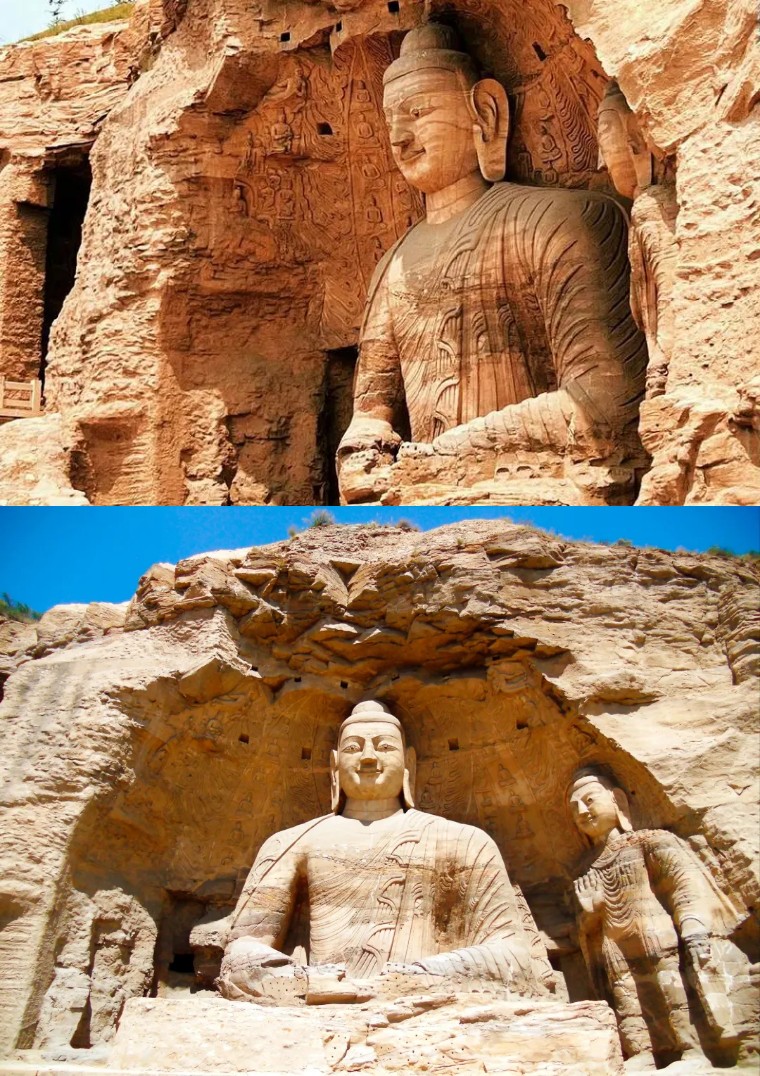 【云冈石窟】位于中国北部山西省大同市城西约16公里的武州(周)山南麓、武州川的北岸,石窟依山开凿,东西绵延约1公里。存有主要洞窟45个,大小窟龛252个,石雕造像51000余躯,为中国规模最大的古代石窟群之一,与洛阳龙门石窟、敦煌莫高窟并称中国三大石窟, 后加麦积山石窟称四大石窟。
