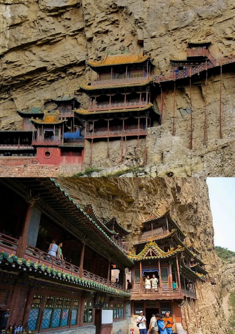 【悬空寺】位于山西省大同市浑源县恒山金龙峡西侧翠屏峰峭壁间,原叫“玄空阁”,“玄”取自于中国道教教理,“空”则来源于佛教的教理,后改名为“悬空寺”,是因为整座寺院就像悬挂在悬崖上,在汉语中,“悬”与“玄”同音,因此得名。建成于公元491年,是佛、道、儒三教合一的独特寺庙。“悬空寺”建筑极具特色,以如临深渊的险峻而著称,素有“悬空寺,半天高,三根马尾空中吊”的俚语,以如临深渊的险峻而著称