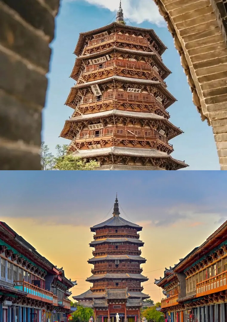 【应县木塔】位于山西省朔州市应县佛宫寺内,始建于辽清宁二年(1056年),是世界上现存最高大、最古老纯木结构楼阁式建筑,与意大利比萨斜塔、巴黎埃菲尔铁塔并称“世界三大奇塔”。