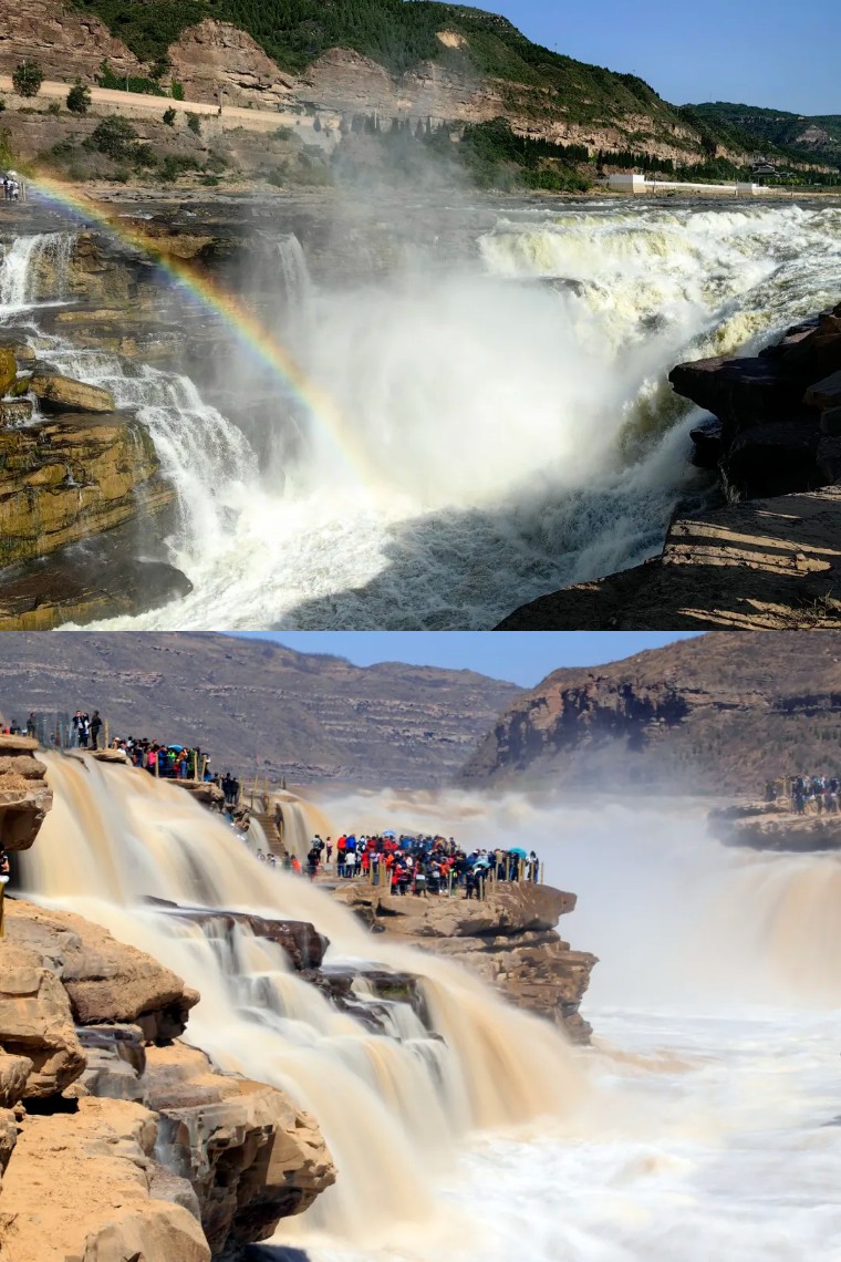 【壶口瀑布】国家级风景名胜区,国家AAAA级旅游景区,西临陕西省延安市宜川县壶口乡,东濒山西省临汾市吉县壶口镇,为两省共有旅游景区。南距陕西西安350千米;北距山西太原387千米。壶口瀑布是中国第二大瀑布,世界上最大的黄色瀑布。黄河奔流至此,两岸石壁峭立,河口收束狭如壶口,故名壶口瀑布。瀑布上游黄河水面宽300米,在不到500米长距离内,被压缩到20-30米的宽度。1000立方米/秒的河水,从20多米高的陡崖上倾注而泻,形成”千里黄河一壶收”的气概。