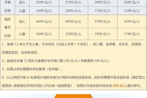 ▷房差:自然拼房2-3人标准间,如不愿拼房或拼不了房者须补单房差(平季600元/人,暑期1000元/人,国庆/春节1500元/人);