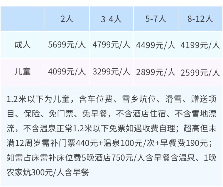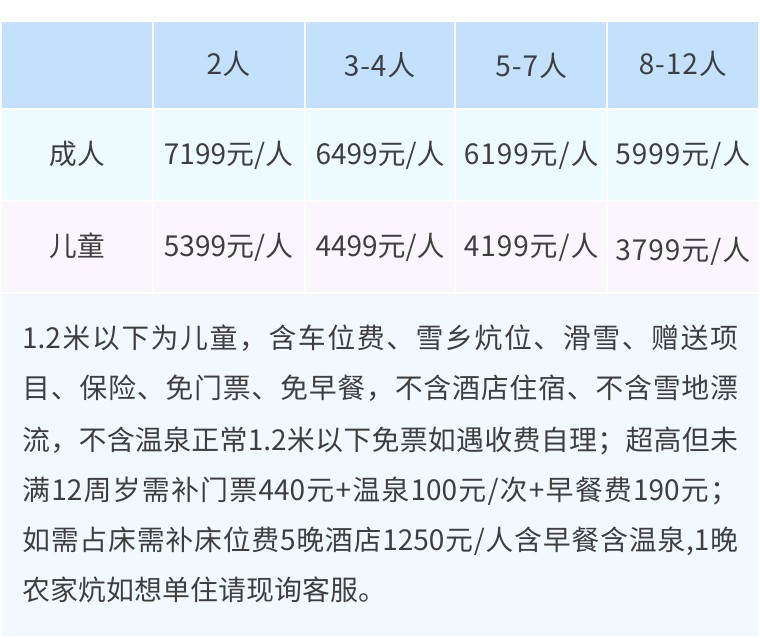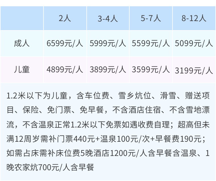 1.2米以下为儿童,含车位费、领队费、雪乡炕位、滑雪、赠送项目、保险、免门票、免早餐,不含酒店住宿、不含雪地漂流、不含温泉,正常1.2米以下免票如遇收费自理;超高但未满12周岁需补门票440元+温泉100元/次+早餐费190元;如需占床需补床位费含早餐含温泉,请参考单房差费用。
