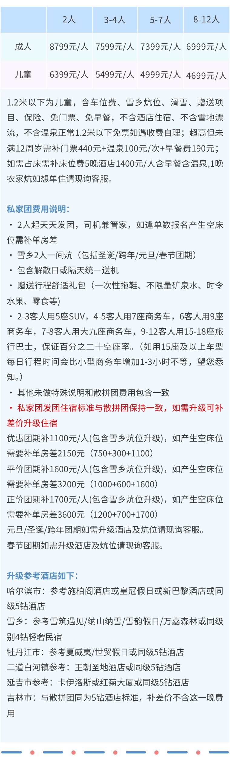 平价团期:5晚酒店 1000元/人、雪乡农家炕1人包炕补600元,2人包炕无需补差价。