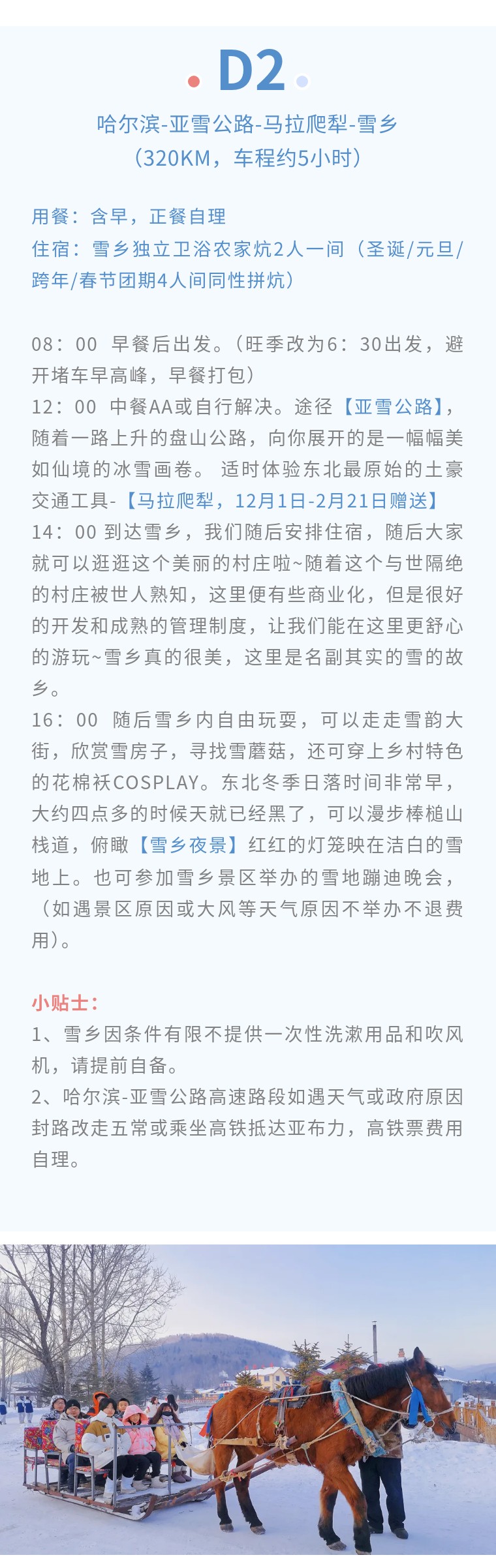 1、赠送体验东北最古老的交通工具马拉爬犁(12月1日-2月21日团期赠送);