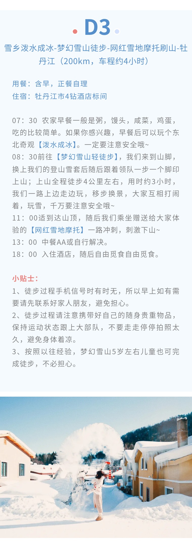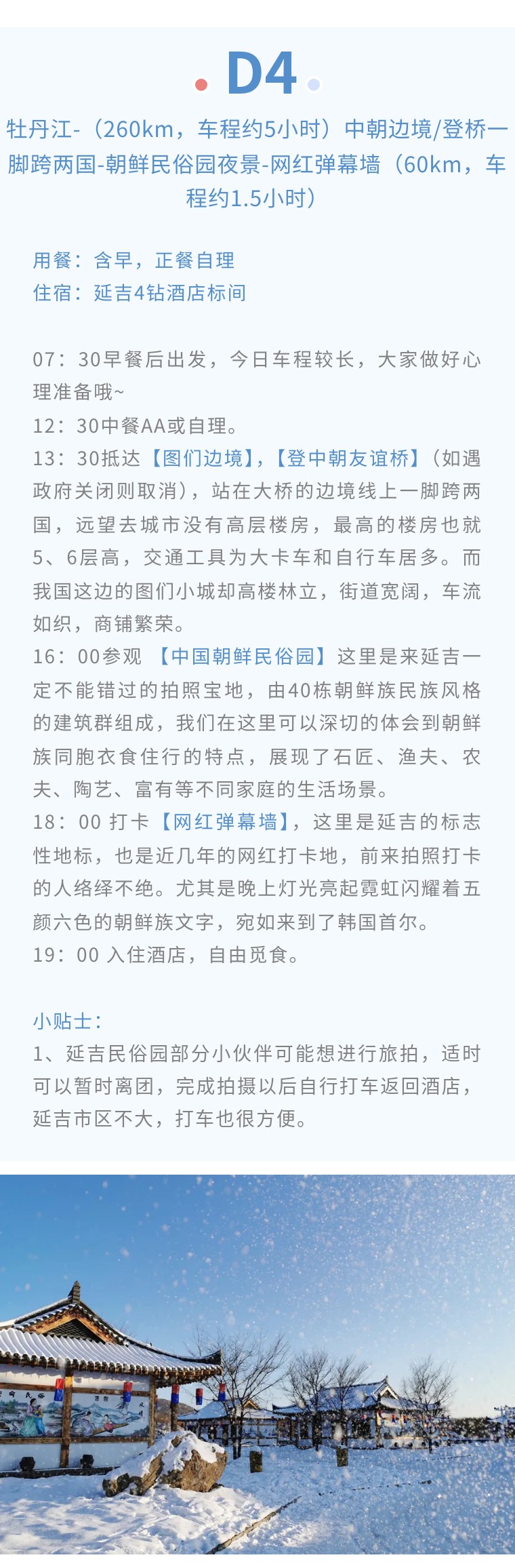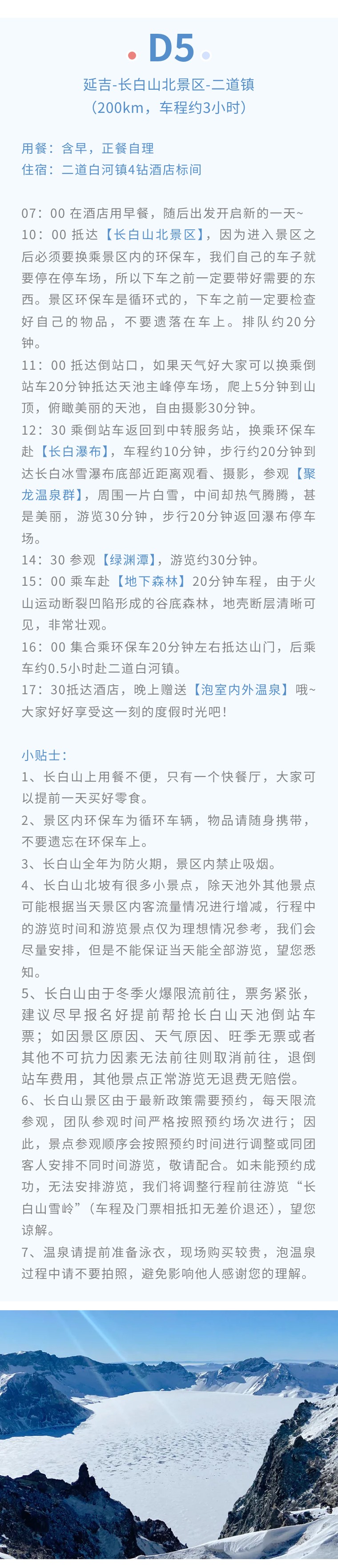 4、门票:雪乡门票+往返环保车、梦幻雪山徒步穿越门票、图们中朝友谊桥门票、朝鲜民俗园门票、长白山北景区全含(门票+往返环保车+摆渡车+天池倒站车)、雪地漂流门票、万科滑雪套票包含(雪鞋雪板雪杖头盔使用+滑雪3小时+雪圈2小时+高山缆车观光1次,滑雪时间从取雪具开始计算,到还雪具结束);