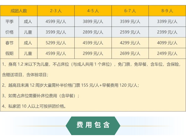 成人:3999元/人,儿童:2399元/人