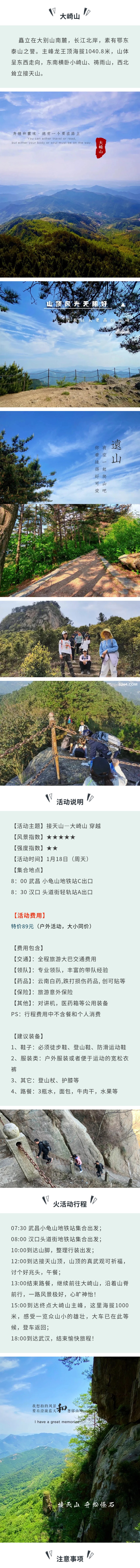 任何方式出行都具有一定的风险概率,大家游玩时需要特别小心和谨慎,切勿做冒险动作,切勿粗心大意,严格跟随带路者前行,不要独自落在团队最后,对某些险要路段犹豫时,可停在原地寻求帮助通过,不要因为面子思想把自己带进险境。
