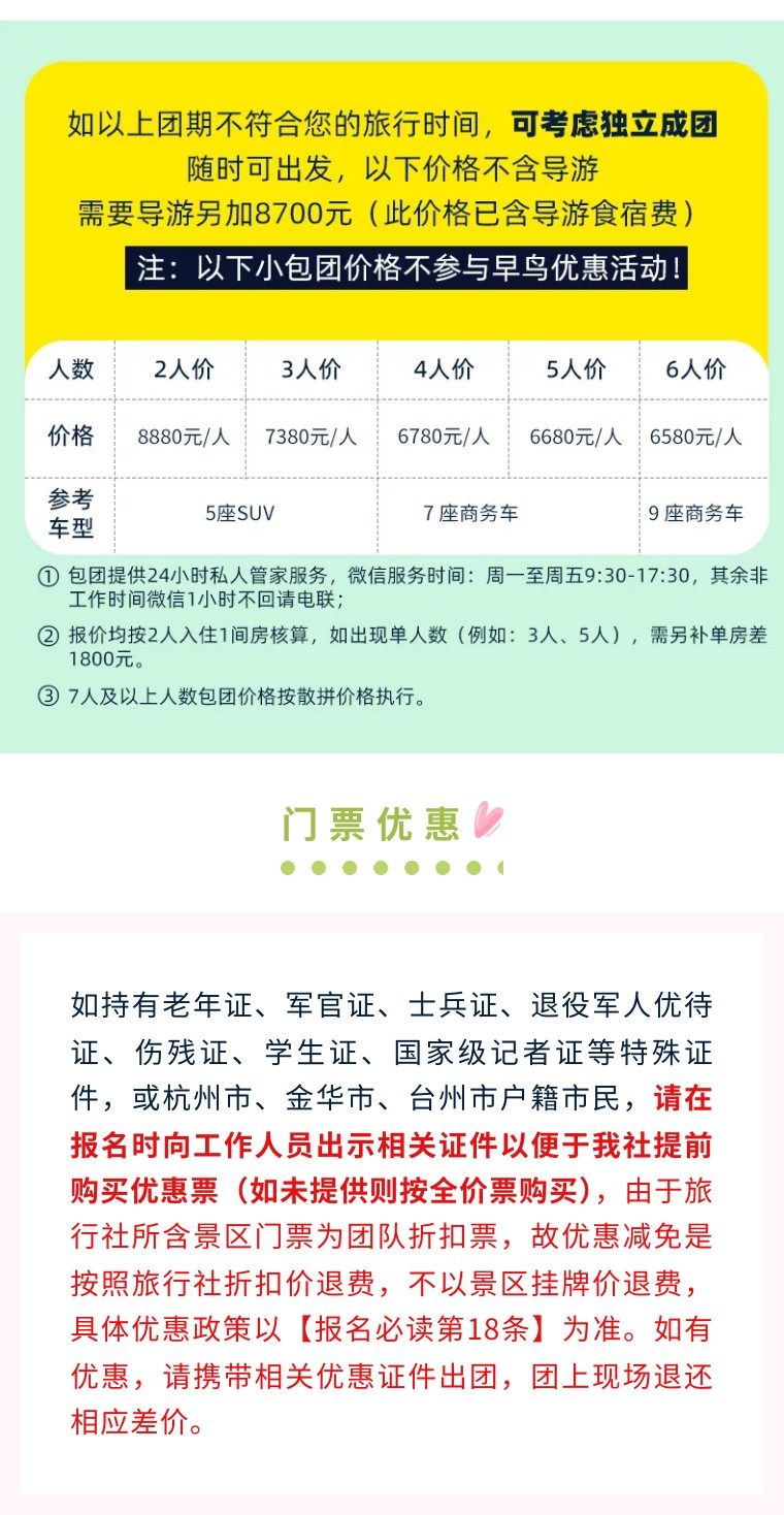 1、交通:8人VIP小团,根据人数确定车辆(全程司机兼向导,已含驾驶员食宿、油费、过路费,驾驶员熟悉线路,会给队员提供行程建议,边走边玩,保证多次停车服务,但不会像专业导游一样解说,且不陪同队员进景区,请理解);