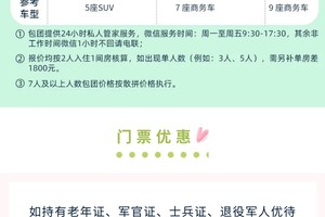 注:接机/站请提前2天告知航班号/车次,否则视为放弃此服务;赠送项目如客人自愿放弃或因特殊原因及不可抗力等原因无法参加,均不退费用,也不等价交换。
