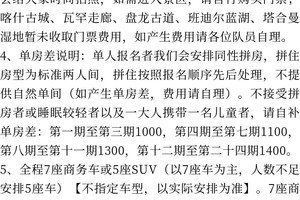 *本活动中所有赠送内容不折现,如因天气、路况、客人诉求等原因不享受不退费,也不等价替换,敬请谅解!备注:组织方提供100万旅行意外险,出行无后顾之忧;