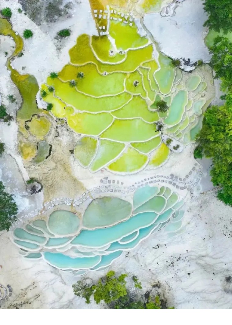白水台也被称为中国版棉花堡,层层叠叠的白色钙化池,自上而下错落有致,形似高山上的梯田,恰如神仙耕耘的“仙人遗田”。