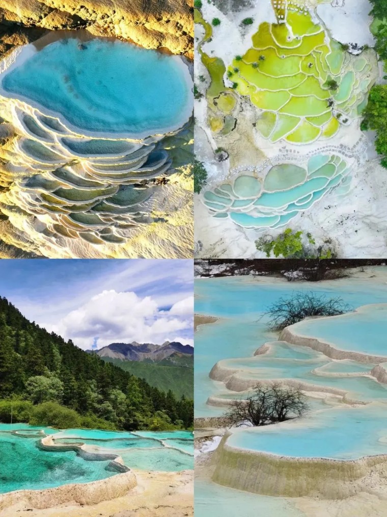 “云波雪浪三千垄”,交错有致、润泽晶莹的钙华彩池,如山间的“蓝莲花”,寄托着人们的美好想象。
