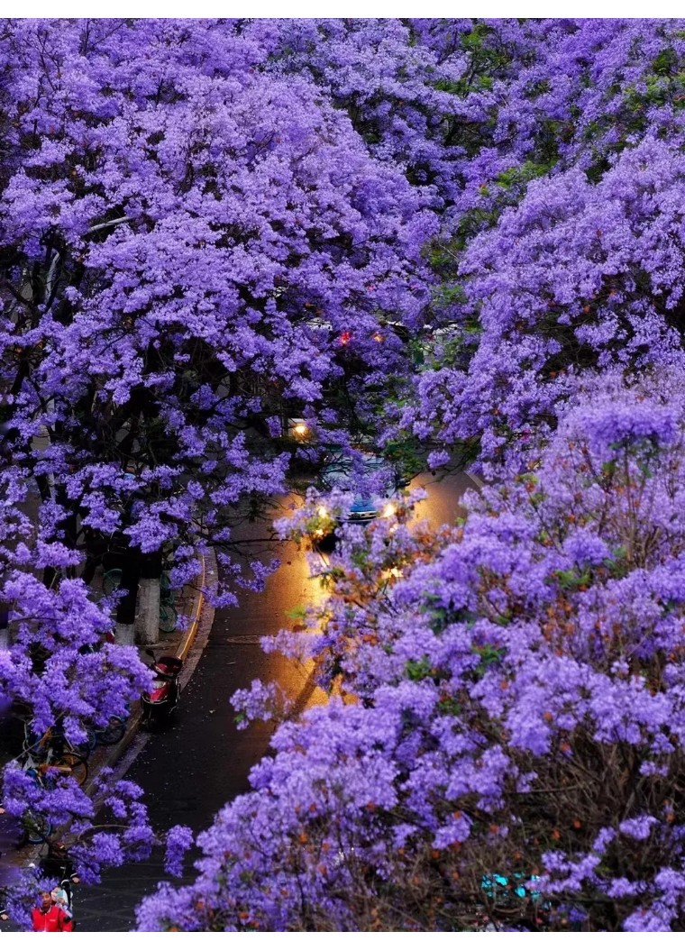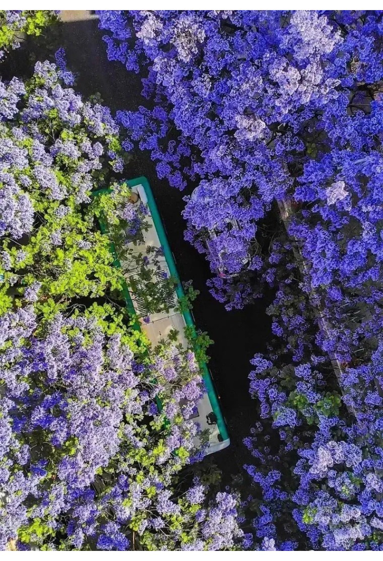 在开满蓝花楹的街道,蓝紫色的花影悄然蔓延,