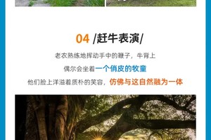 随后我们欣赏【赶牛表演】,观看赶牛表演仿佛穿越到了古代的乡村生活场景。在古榕树的映衬下,阳光透过树叶洒下斑驳的光影,农夫牵着牛缓缓走过,牛儿温顺的模样和农夫古朴的装扮,加上周围原生态的环境,让人感受到一种宁静与和谐。游客可以近距离拍摄到富有诗意的画面,留下美好的回忆,仿佛置身于一幅田园风光的画卷之中。