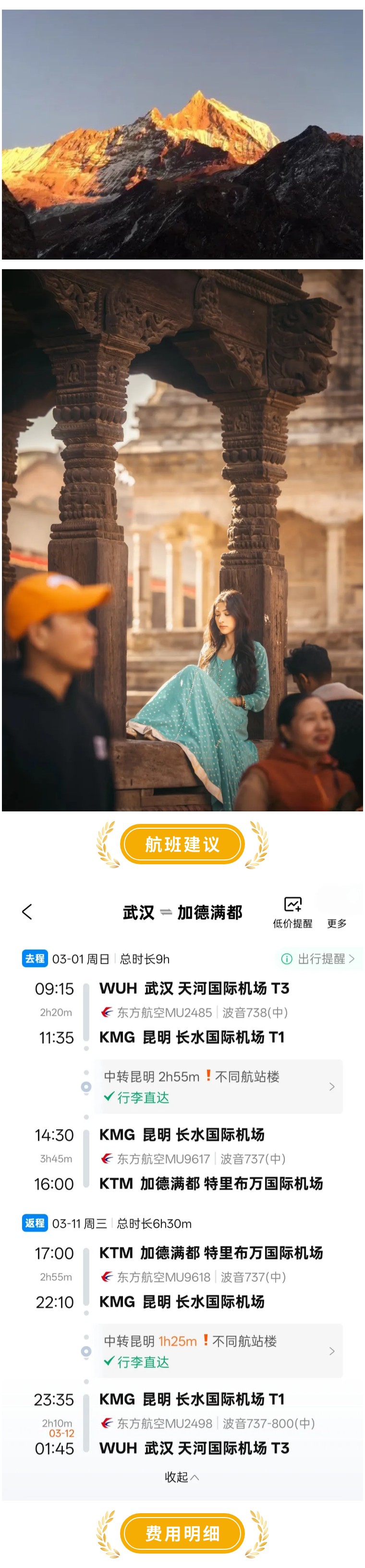 穿越时空隧道抵达尼泊尔首都,在杜巴广场的鸽群飞舞中感受中世纪建筑群,夜晚在泰米尔街区的香料香气与风铃声里开启神秘国度初体验。