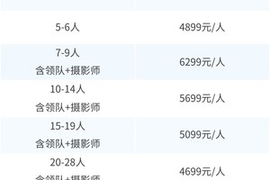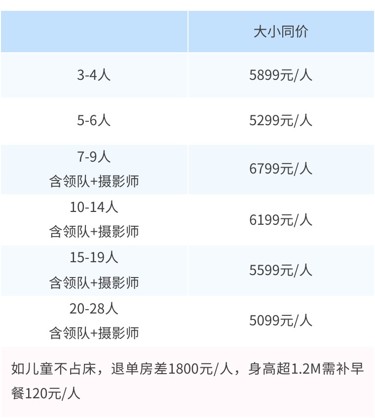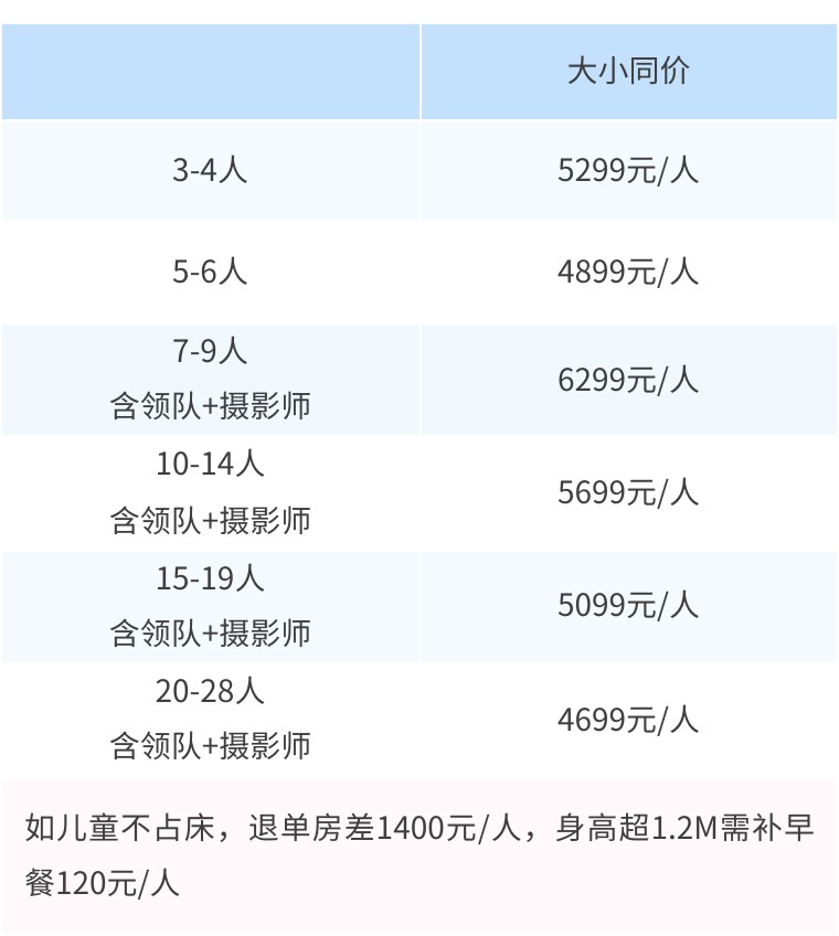 大小同价5099元/人,单房差1800元/人