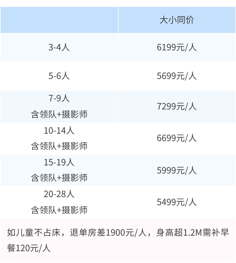 大小同价5499元/人,单房差1900元/人