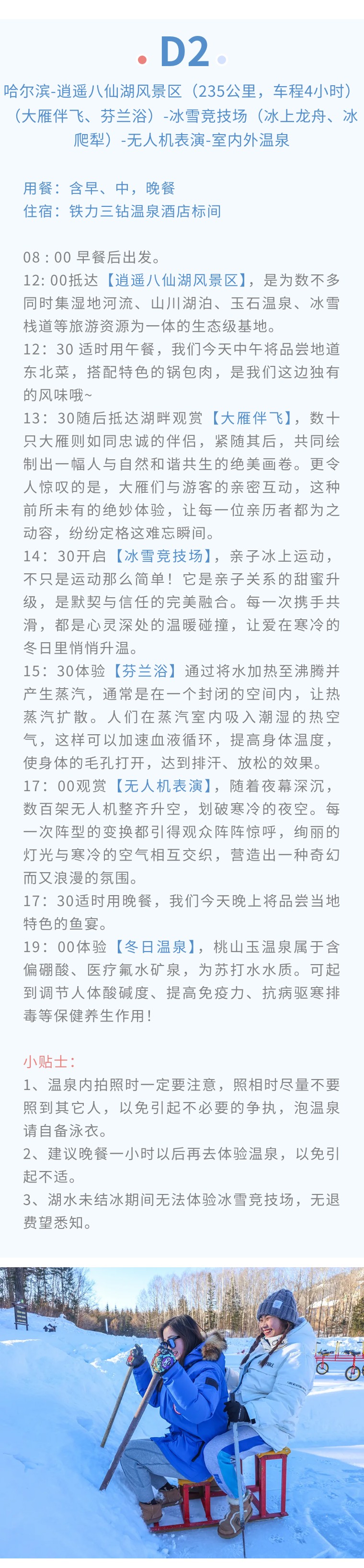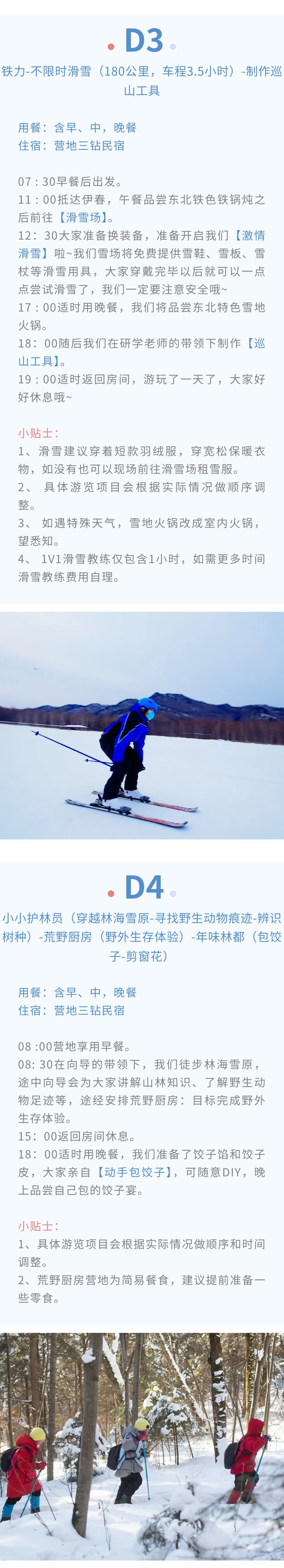 2、 用餐:包含5顿早餐,8顿正餐(东北菜+鱼宴+铁锅炖+雪地火锅+荒野厨房+包饺子)
