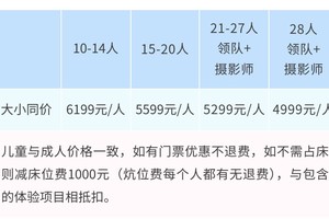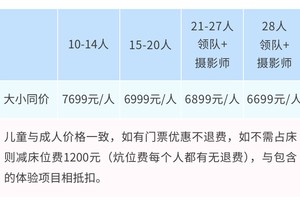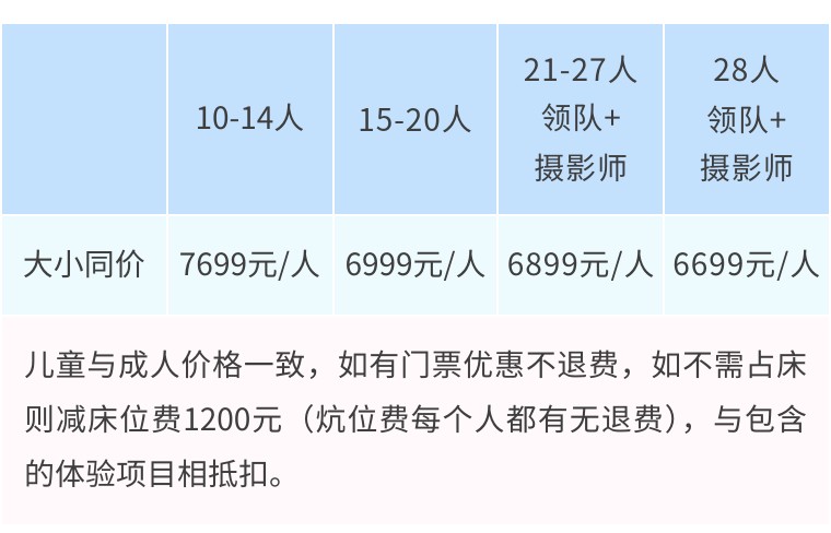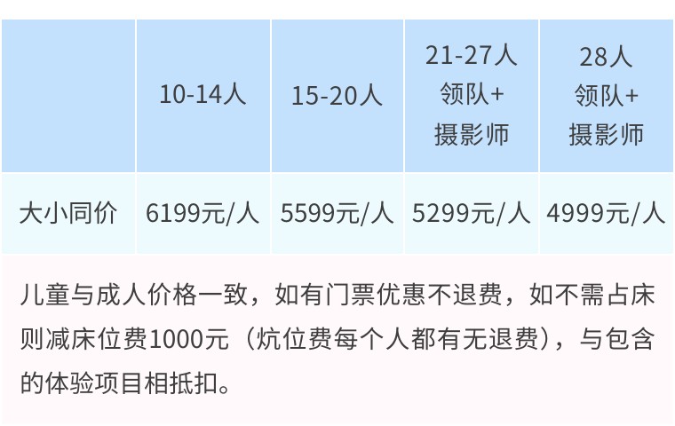 儿童价格和成人一致,如有门票优惠不退差价与儿童研学费用相抵扣;如儿童不占床则退酒店用房差价(一大一小报名必须用一间房无退费,退酒店差价情况为两大一小或两大两小用一间房等类似场景),农家炕默认为一个家庭用一间炕(2-4人炕,根据人数安排炕的大小)无需补差价或退费,特殊情况除外。