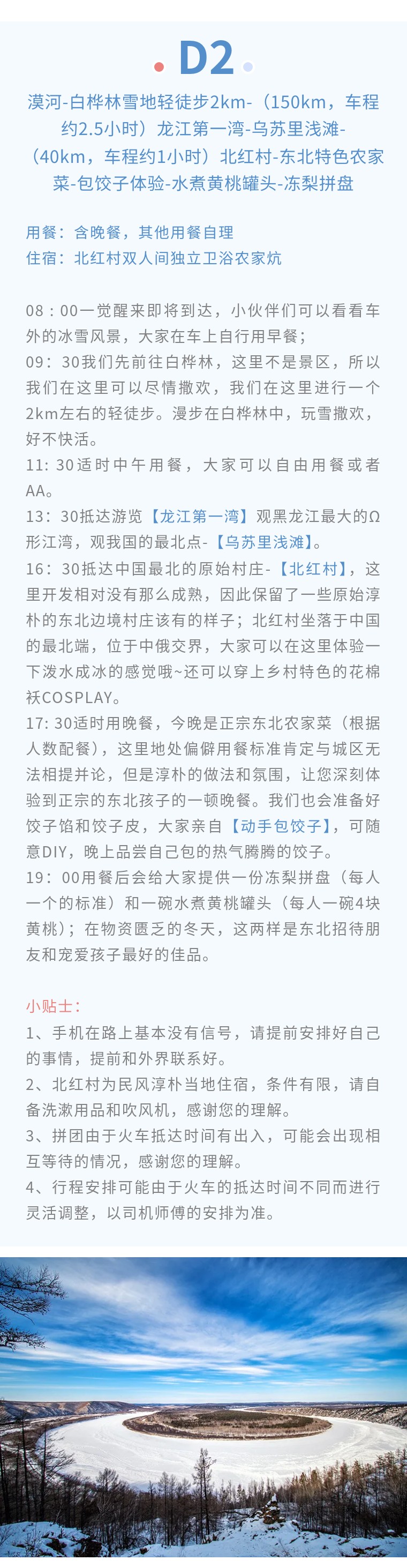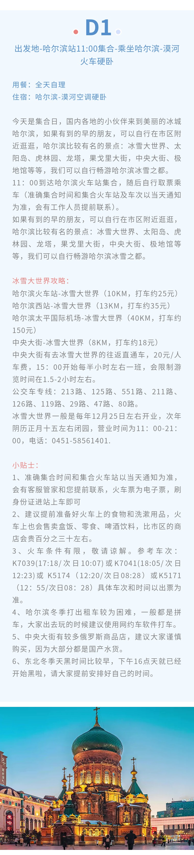 春节团期:漠河段2晚住宿补300元/人,补1晚哈尔滨住宿350元/人,1晚农家炕如想单住请现询客服;