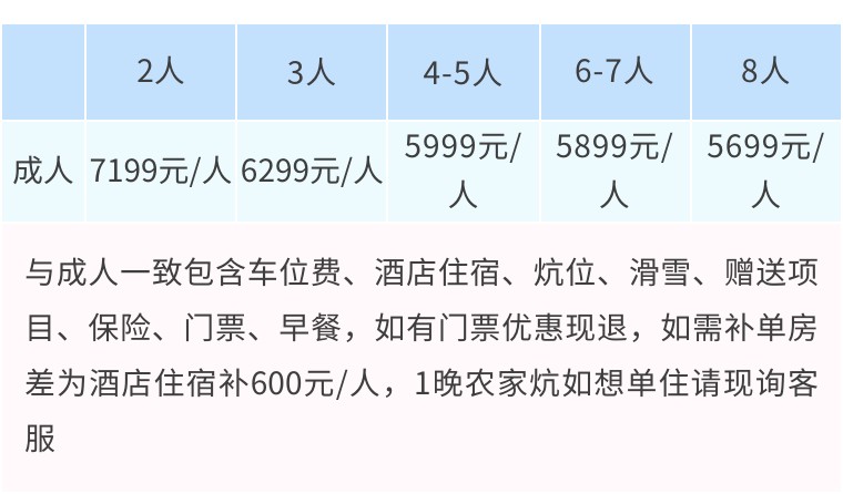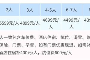 平价团期补1600元/人(包含雪乡炕位升级),如产生空床位需要补单房差2600元(400+600+1600)