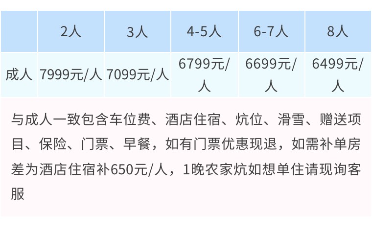 单人报名全程默认安排拼房,不收单房差,如需单住需自补单房差(1大1小报名必须补炕差)。
