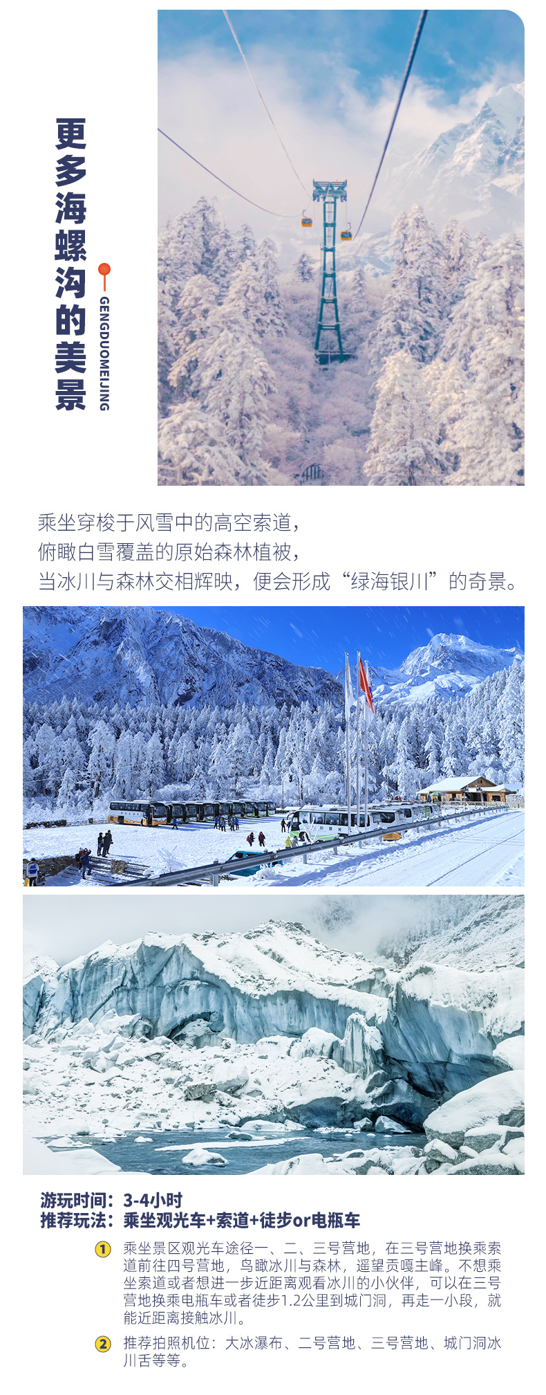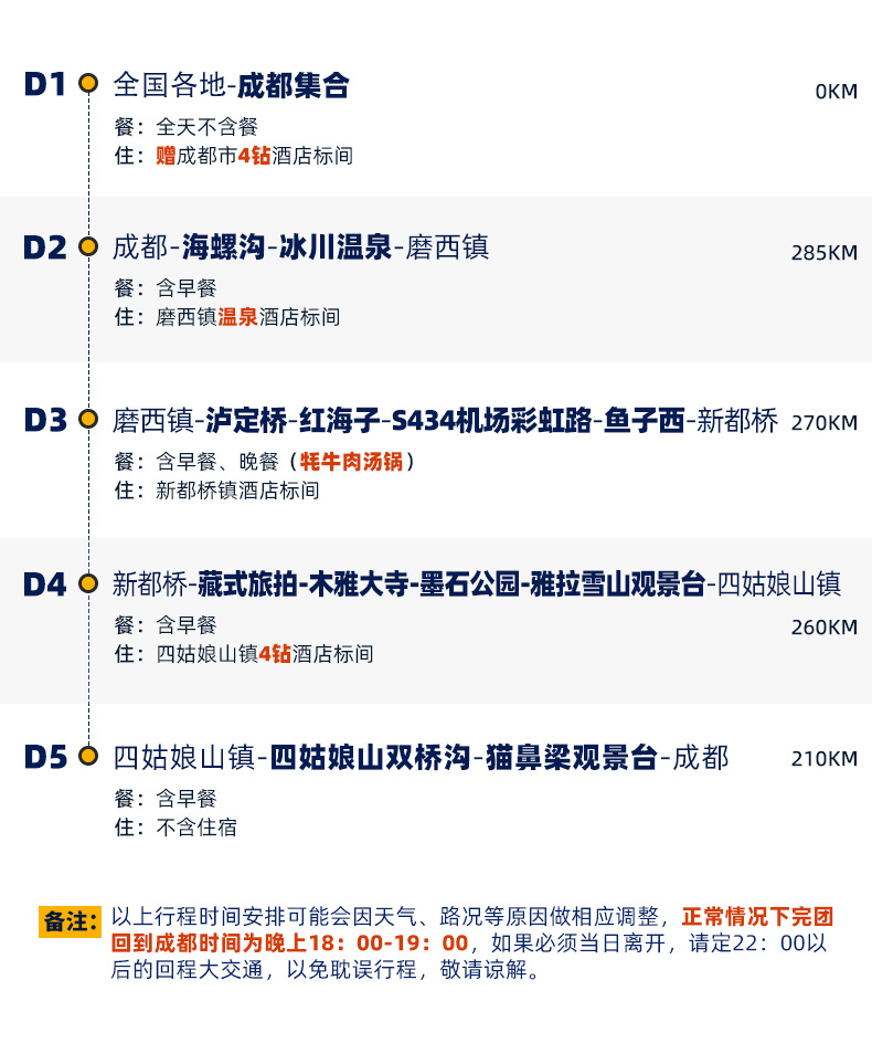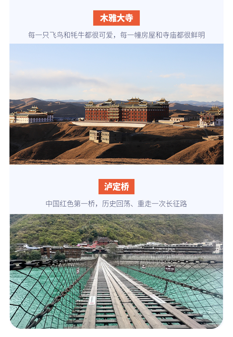 4、景交:海螺沟观光车70元/人(必须)、海螺沟索道135元/人(往返、可选)、海螺沟电瓶车30元/人(可选),四姑娘山双桥沟观光车70元/人(必须),墨石公园观光车20元/人(必须),泸定桥保险5元/人(可选),木雅大寺门票16元/人(可选),红海子清洁费30元/人(可选),鱼子西清洁费30元/人(必须);
