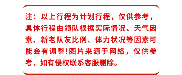 6.成团说明:根据活动具体报名情况,有存在不成团的可能,如不够成团人数或特殊原因,1-2日活动距出发之时12小时未能达到成团人数,2日以上活动距出发之时3日未能达到成团人数,本次活动可能延期或取消,也可协调其他成团活动,如已缴费可全额申请退款,但不做活动赔偿,报名视为同意成团说阳望周知!