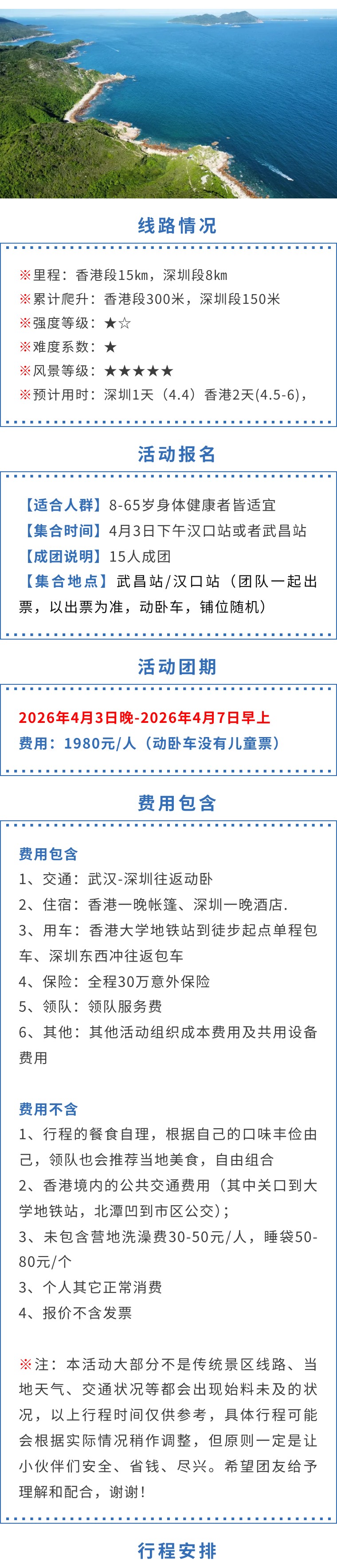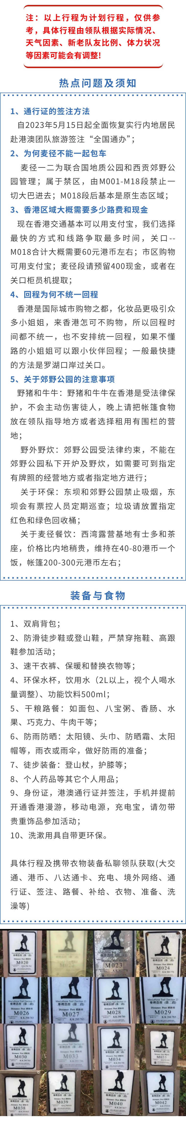 7:30吃完早餐后集合出发,徒步到罗湖口岸过关(港澳通行证、签注都在有效期内),过关后坐地铁前往香港大学地铁站出来包车前往东坝,打卡最美海岸线:徒步麦理浩径精华段(2段),经过海岸线,沿途美景美不胜收,晚上在沙滩扎营!
