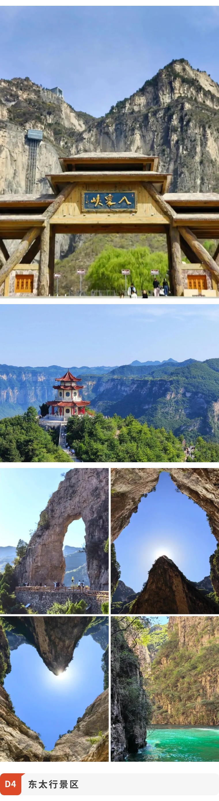早餐统一退房后,岀发【太行山八泉峡大峡谷5AAAAA风景区】乘车1小时到达徒步穿越自然风光旅游区。从陆、海、空三个角度体验四大游览区:伟人峰·伯阳山;云崖栈·天上人家;高峡平湖·八泉源;皮筏游·绝壁走。该四大区域涵盖了伟人峰、雄鸡唱晓、八泉云梯、中天门、北天门、玉皇阁、南天门、生肖岭、瑶池、电梯广场、时空隧道、高峡平湖、灵猴谷和小、中、大八泉眼等百余处景观。全天游览八泉峡景区。游览结束后去往林州市入住酒店。