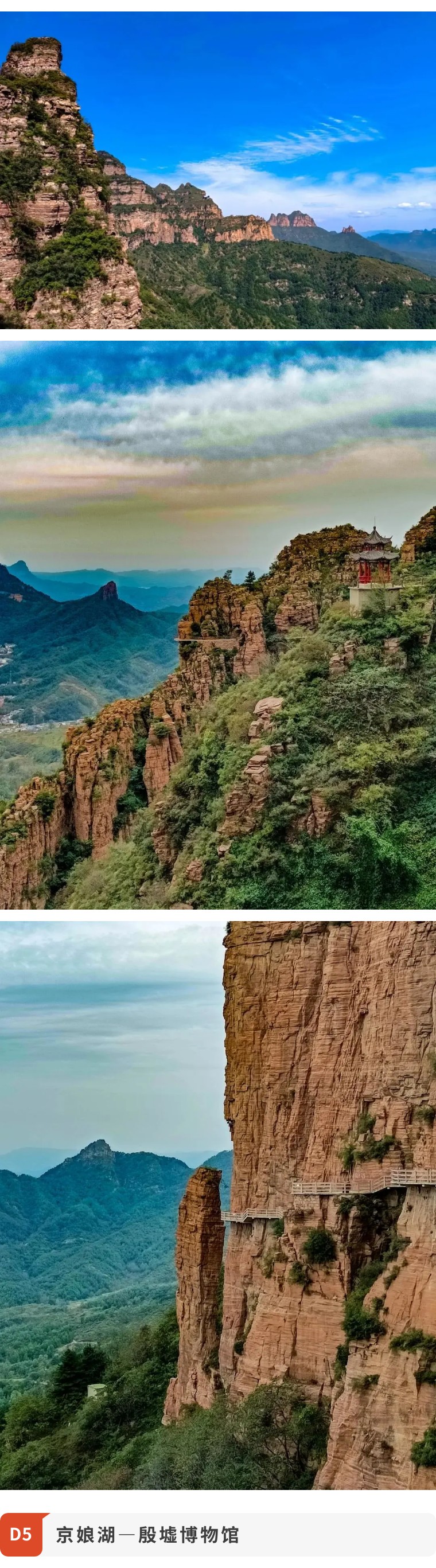 早餐后前往京娘湖,京娘湖位于河北邯郸武安市活水乡口上村,是国家 4A 级景区,同时为国家级水利风景区、森林公园与地质公园,因宋太祖赵匡胤 “千里送京娘” 的凄美传说得名,有 “太行三峡”“太行明珠” 之誉。游览京娘湖结束后前往殷墟博物馆,殷墟是中国历史上第一个文献可考、并为考古学和甲骨文所证实的都城遗址,拥有包括甲骨文在内的诸多重大发现,展示了中国辉煌历史和中国考古巨大成就。游览约2小时,游览结束后去往安阳市入住酒店。
