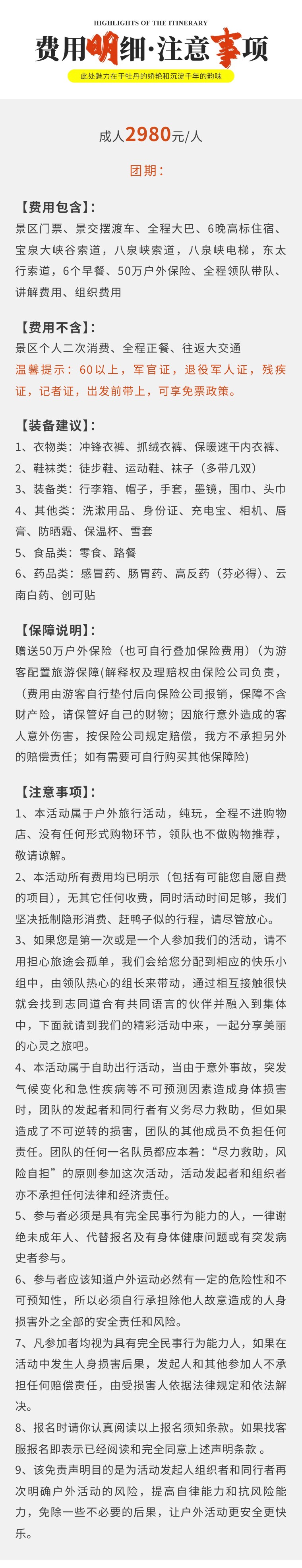 温馨提示:我们会在出发集合前2--3天发集合信息给大家,会告知集合酒店的名字、地址、电话及到达酒店的交通方式和领队的联系电话。请注意查收!