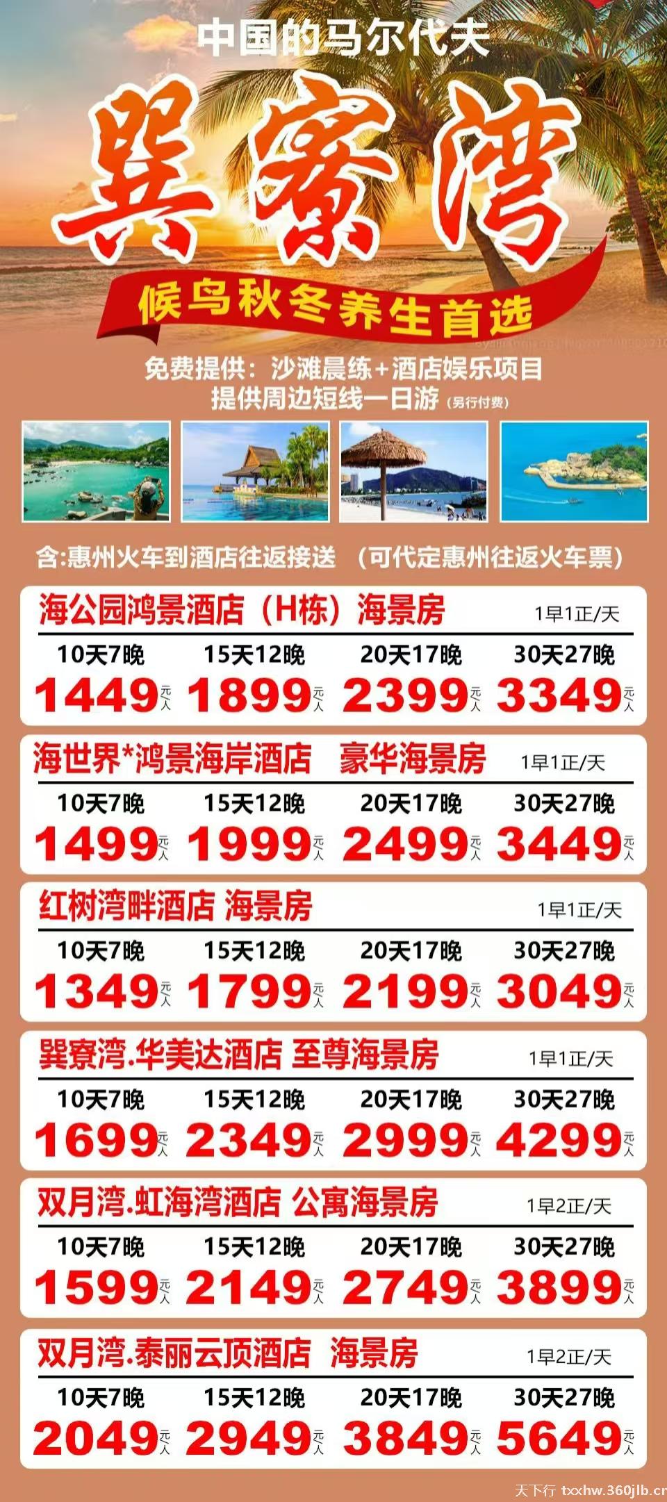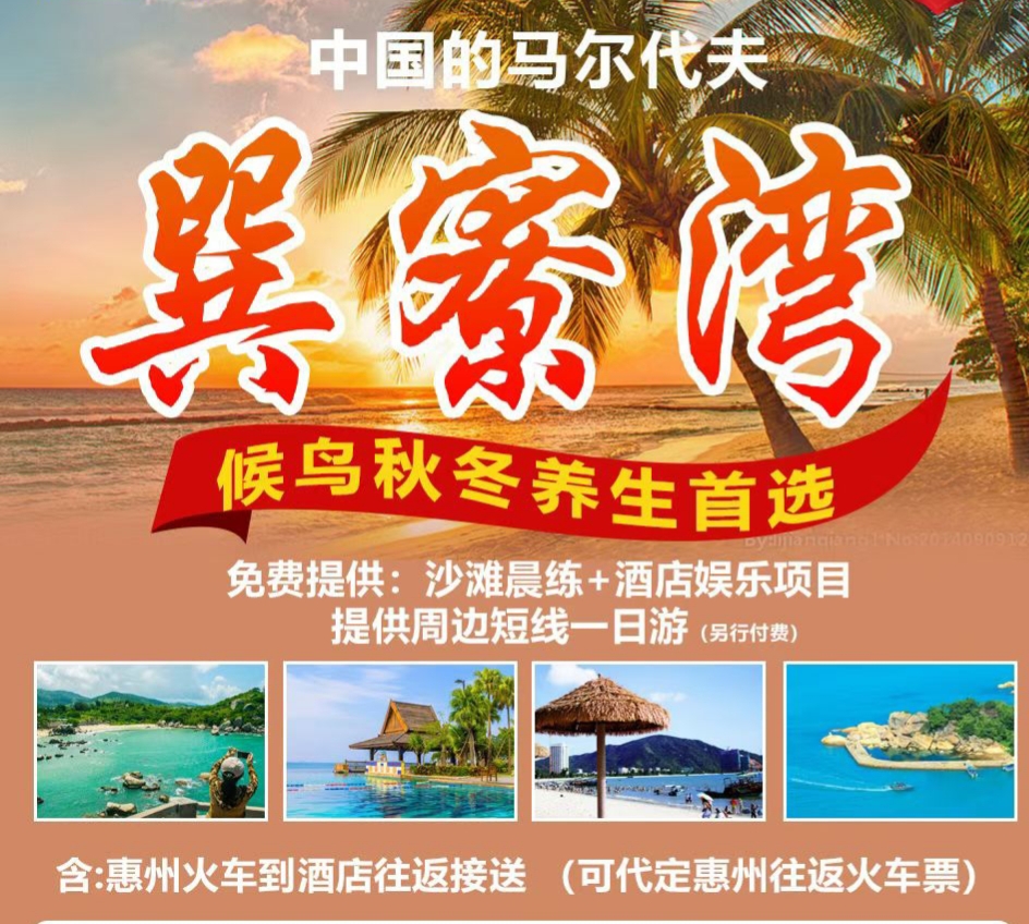【巽寮湾旅居】10天15天20天30天自定 免费提供:沙滩晨练 酒店娱乐项目 提供周边一日游 含惠州火车到酒店往返接送 [复制链接]